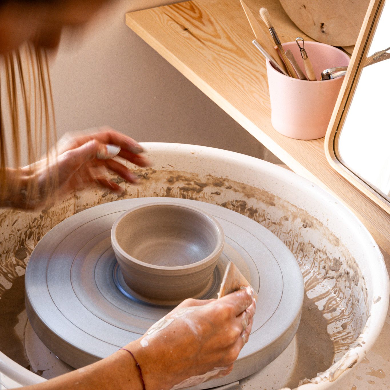 Następnie z pomocą osoby prowadzącej spróbujesz wykonać swoje pierwsze naczynie (miseczkę). Po tej rozgrzewce wytoczymy jeszcze kubeczek oraz jeszcze jedno naczynie o dowolnym kształcie. Po wytoczeniu 3 naczyń podsuszymy je aby opracować ich spody.